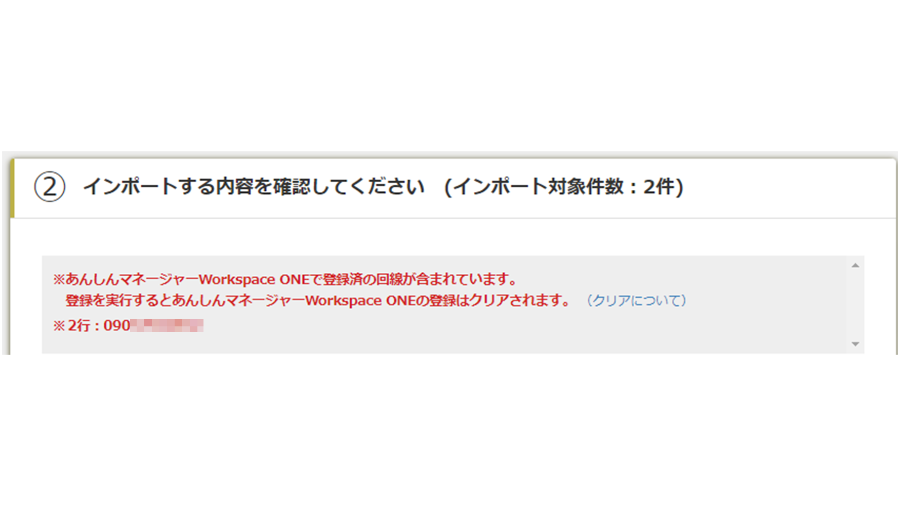 インポートするファイルを決定した際に、以下のメッセージが表示された場合は「あんしんマネージャー Woekspace ONE」でご利用中の回線となります。