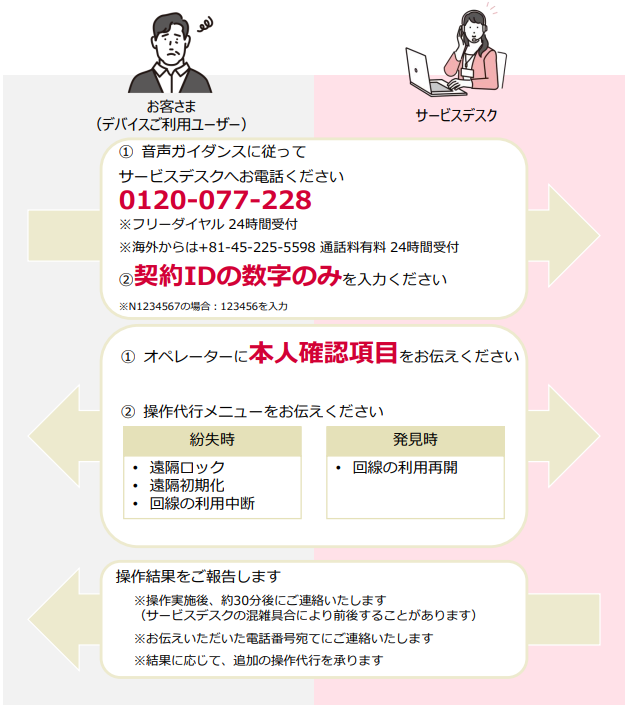 ビジネスサポートパック NEXT のライトプラン/スタンダードプランをご契約いただくとデバイスを紛失した際に、専用のサービスデスクがあんしんマネージャー NEXT の紛失時操作をお客様に代わって実施いたします。